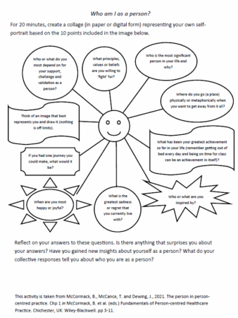 One of the tools we use to support this process is the Who am I as a person? activity from Chapter 1, page 5 of the Fundamentals of Person-Centred Healthcare Practice by Brendan McCormack et al, Wiley Blackwell.